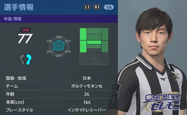 新10番としてすっかり定着した中島。ウイイレではポルティモネンセと日本代表候補選手として登場する。