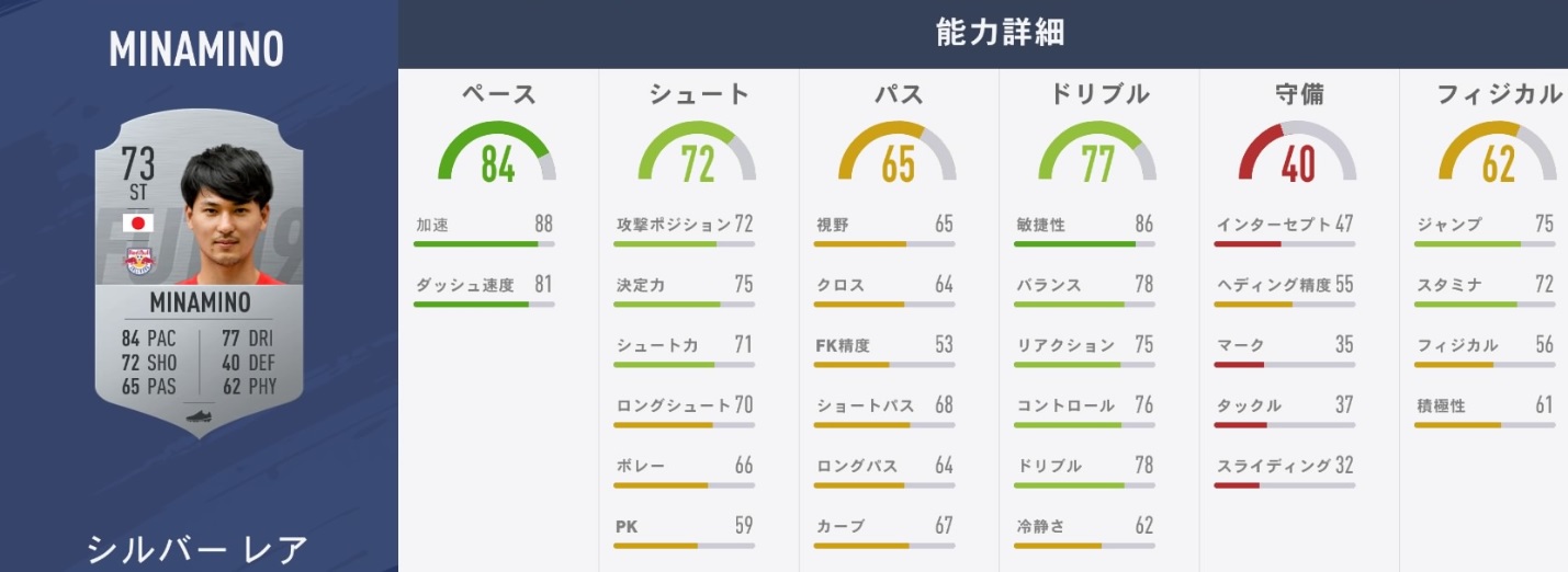 本人もターンからのシュートが持ち味と自負しているが、敏捷性86と高く評価されている。スピードと加速88+ダッシュ速度81と高め。