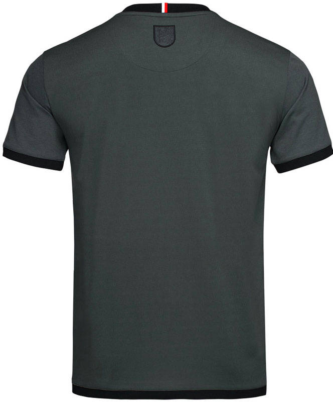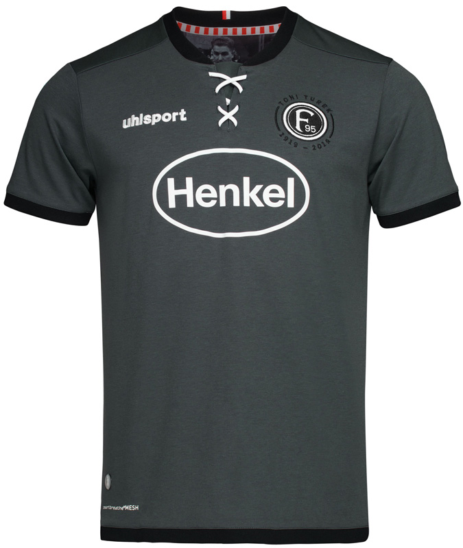 デュッセルドルフ市の色であるレッド/ホワイトで首元を彩り、その下にはダークグレーで市の紋章を配する。そして内側の首元には、トゥレクの写真をプリント。