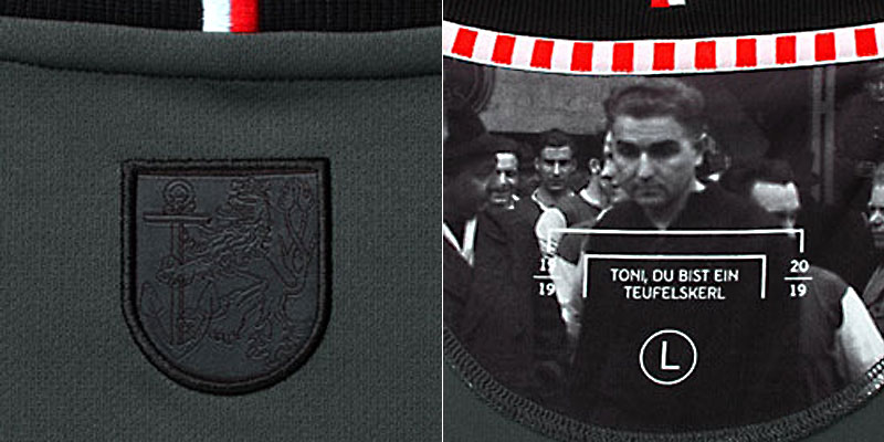 この特別ユニフォームの色はチームカラーのレッドではなく、トゥレクが着用していたキットにちなみグレーを基調としたダークカラー。胸元の編み上げがクラシックな雰囲気を演出する。そしてレジェンドに敬意を表し、エンブレムは「Toni Turek 1919-2019」の文字で飾った。