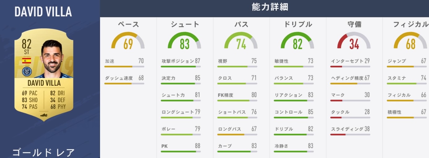 かつてはスピードも売りだったが、69とさすがに低めに。ただ、ポジションや決定力、PKといった能力は80台後半。