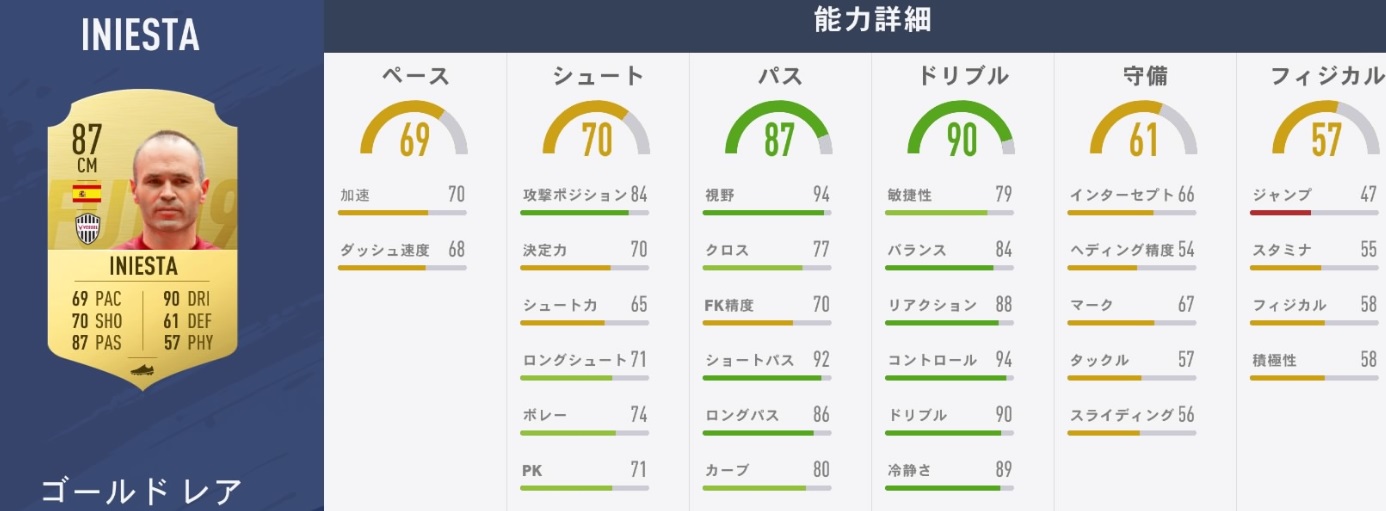 総合値87と高レートなイニエスタは、90超えの能力が4つもある。