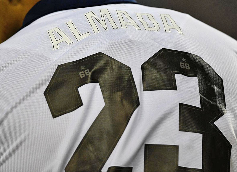 襟と胸のV字は1968年当時と同じネイビー。エンブレムとメーカーロゴも同系色でプリントしているため、まったく目立たない。現在は日本企業の「HITACHI」がメインスポンサーだが、キットに敬意を表してか、企業ロゴマークを胸から外している。
