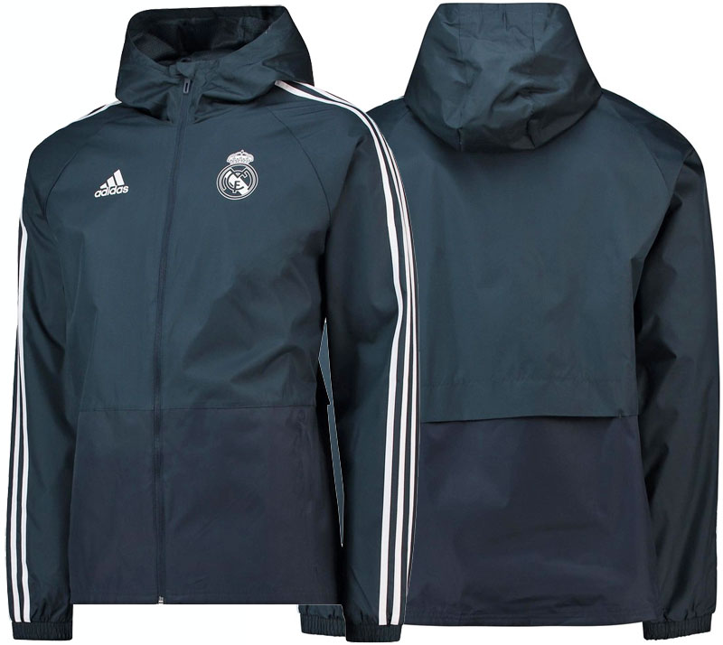 選手がトレーニング時に着用するフード付きのレインジャケット。
