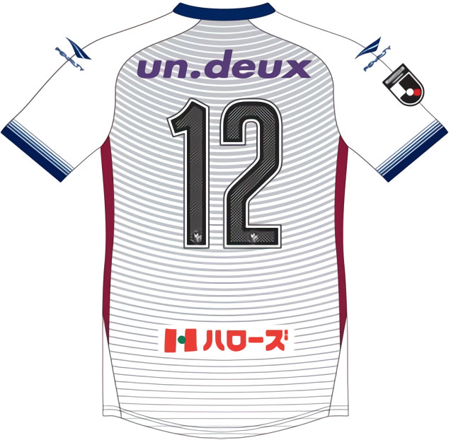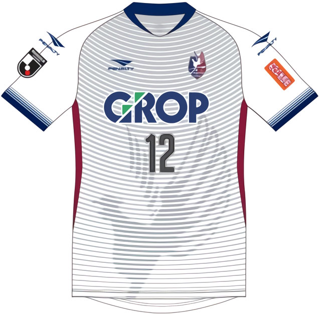 アウェイキットは大胆なデザインが登場。カーブラインのグラデーションをベースに、岡山県の“県の鳥”でありクラブのシンボルでもある雉(キジ)の透かしプリントをあしらう。右袖にはロゴマークをリニューアルしたJリーグパッチを装着。