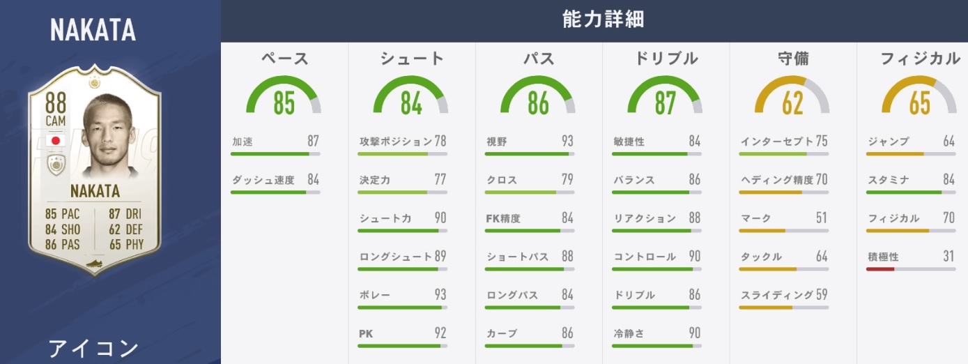総合値は88と高レート!スピードやパス、そしてシュートやドリブル値も軒並み高い値になっている。