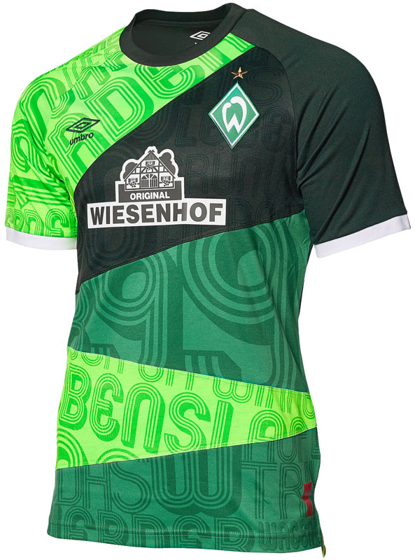 記念すべき120周年記念キットは、いくつものパーツを縫い合わせたマッシュアップジャージに。各パーツにはスローガンなど、クラブに関するワードがプリントされている。濃淡のグリーンは過去のユニフォームに使われた色で、ブレーメンの歴史そのもの。
