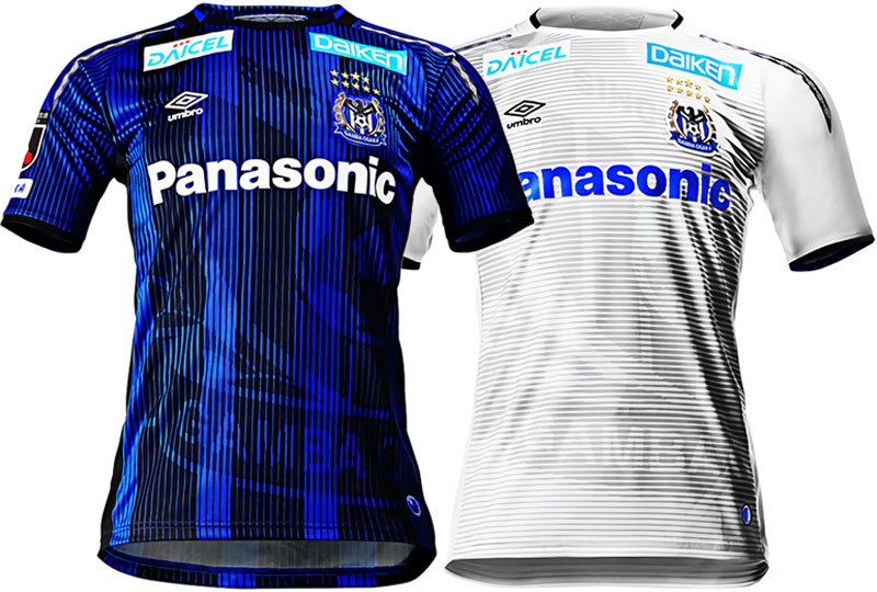 エンブレムを濃淡のピンストライプで大胆にあしらったG大阪のユニフォーム。クラブのプライドを忘れない、強い意志と決意を表現している。