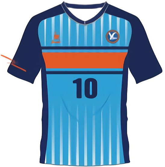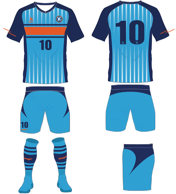 ホームキットのコンプリートルックはこんな感じで、基本的には全身ブルーを継続。パンツのサイドの曲線図形は、港町のチームらしくガルウイング(かもめの翼)の先端をイメージしている。