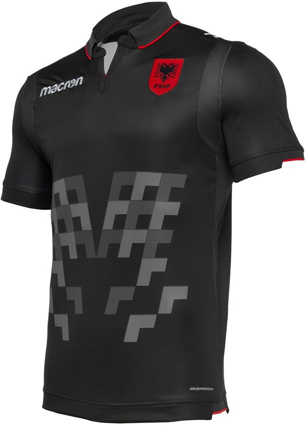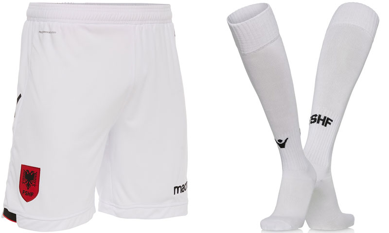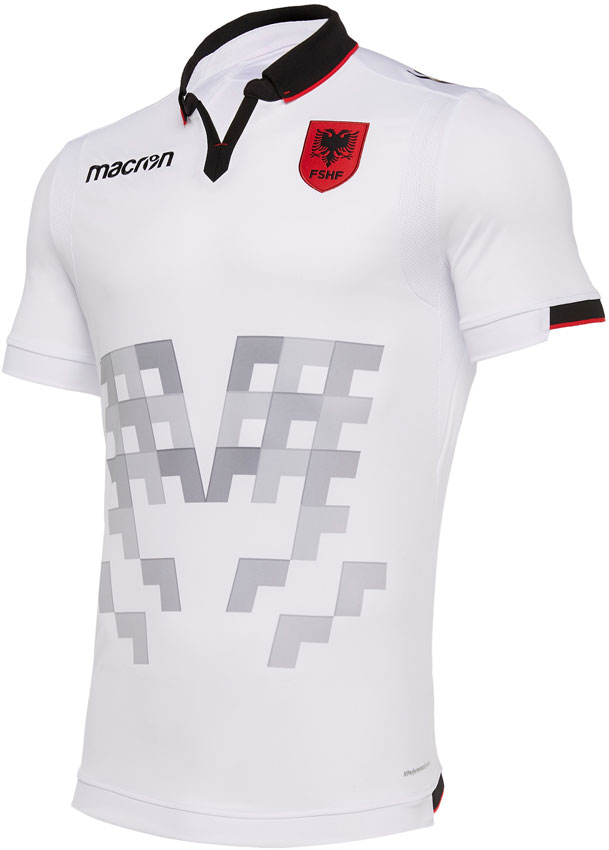 アウェイキットも前モデルから引き続きホワイトを基調。NEWモデルは共通で前面にグラフィックが入るが、これはエンブレムの双頭の鷲をデザイン化したもの。この双頭の鷲はアルバニア民族の英雄スカンデルベグが15世紀に用いたもので、歴代国旗にも描かれている。