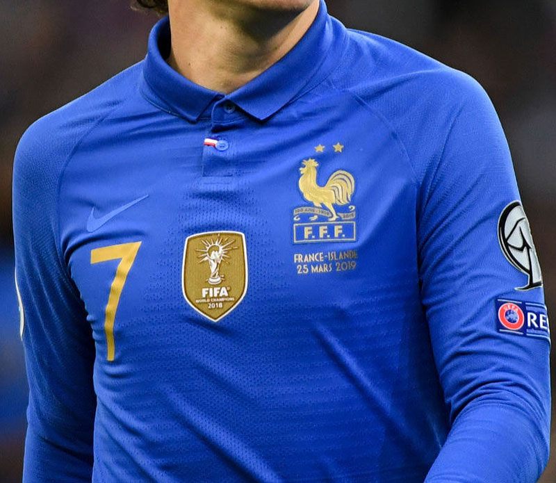 選手着用キットのエンブレム下には、フランス語でアイスランド戦のマッチデイ(FRANCE - ICELANDE 25 MARS 2019)をプリント。