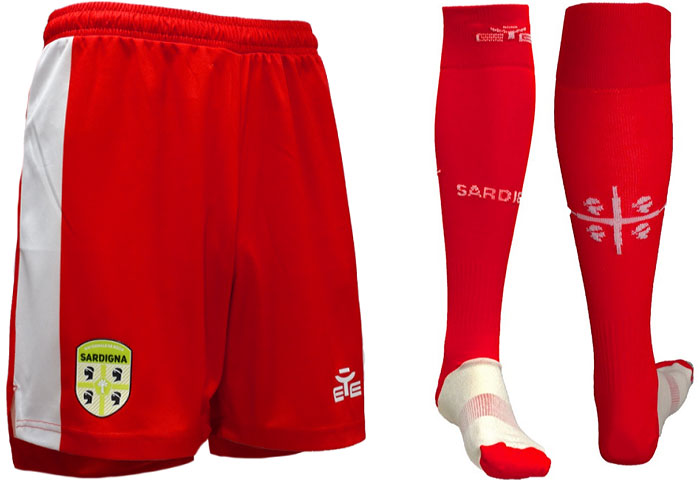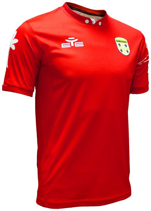 GKキットはレッドを基調。この色はサルデーニャの旗や紋章に使われている。首周りは立ち襟で、2つのボタンは飾りだろうか。