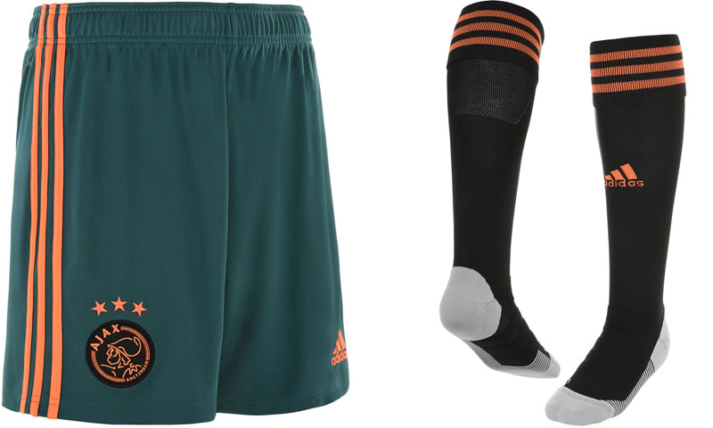 NEWアウェイキットは、久々にダークグリーンを採用。垂直ストライプの中にピンストライプをあしらい、さらに斜めストライプを重ねる複雑なデザインとなっている。スリーストライプスなどの差し色にはオレンジを配し、アヤックスとしては珍しい色のコンビネーションに。