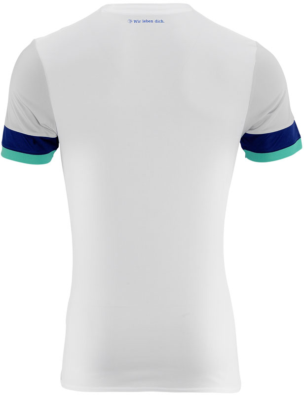 アウェイキットはホワイトを基調としたデザイン。袖はライトグレーを配し、袖口にはブルーとグリーンを当てている。この3色のうち、ホワイトとグリーンはホームタウン(ゲルゼンキルヒェン)の旗に使われている色だ。