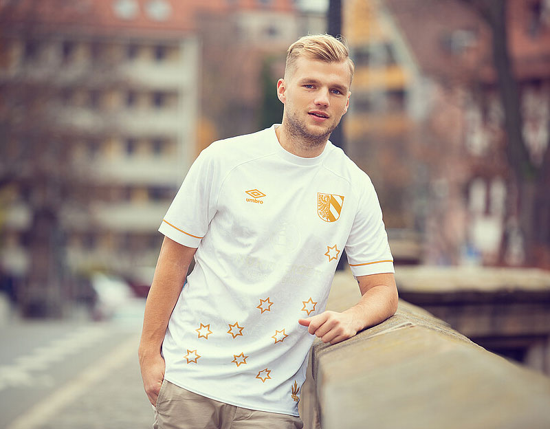 今回の左胸のエンブレムは、通常のチームクレストではなくニュルンベルク市の紋章。キットは雪を連想させるホワイトを基調に、華やかなゴールドの差し色で統一する。