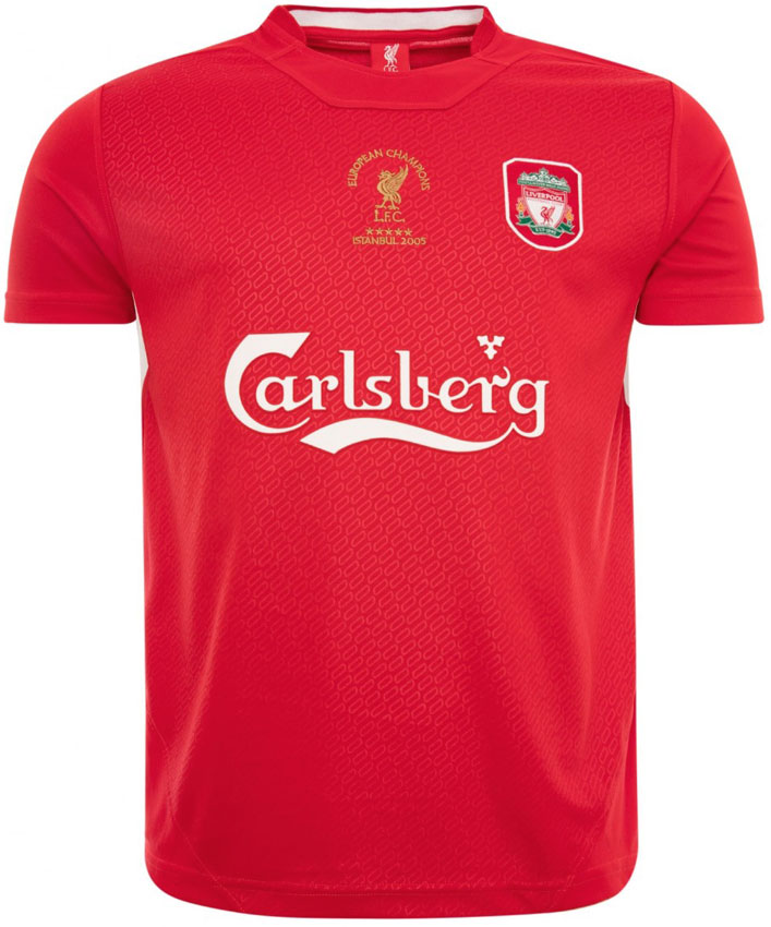 リヴァプールのサポータなら一生忘れることがないだろう、チャンピオンズリーグを優勝したキットだ。04-05シーズンのCL決勝ではPK戦の末にACミランに勝利。スコア0-3から追いついての優勝は「イスタンブールの奇跡」と呼ばれる。胸中央にゴールドのライヴァーバードを配置し、その上にはアーチ型で「EUROPEAN CHAMPIONS」、下には「ISTANBUL 2005」をレタリングしている。