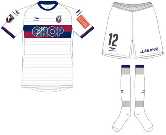 新アウェイユニフォームはホワイトをベースカラーに、グレーのピンボーダー柄というデザイン。ファジアーノレッドからネイビーに変化するグラデーションラインを胸にあしらう。
