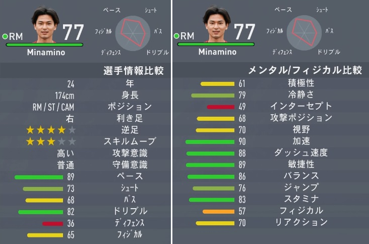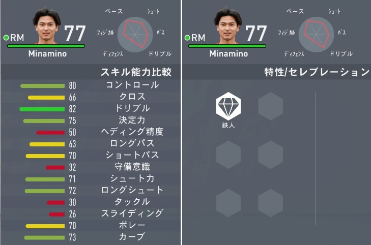 ただ、攻撃ポジション(73→68)、ロングパス(64→63)、ショートパス(71→70)、ヘディング精度(51→50)タックル(39→30)、スライディング(34→26)、リアクション(73→70)などは数値が下がっている。メインポジが変更された影響もあるのだろうか。