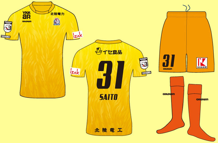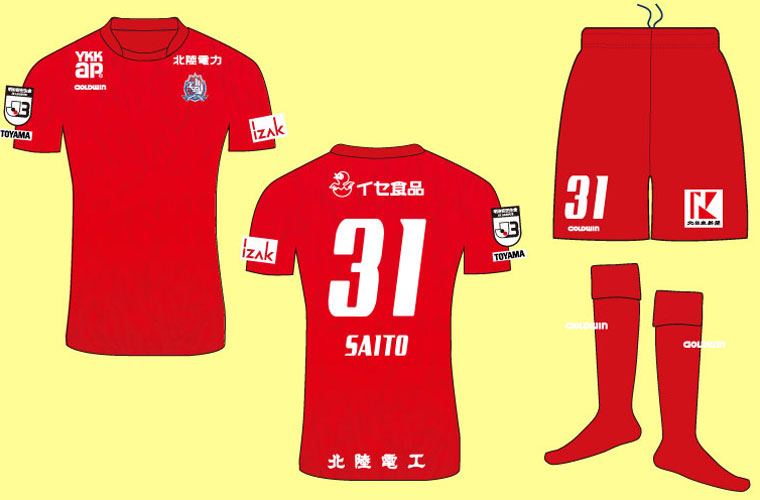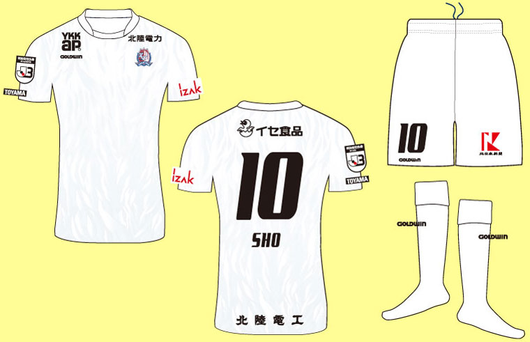 アウェイユニフォームはホワイトで継続。各部のスポンサーは、右鎖骨が「YKK」、左鎖骨が「北陸電力」、背中上が「イセ食品」、背中下が「北陸電気工事」、左袖が「IZAK(アイザック)」、パンツが「北日本新聞」となる。