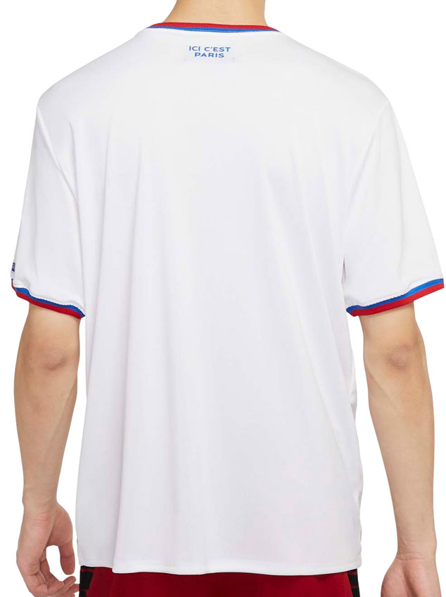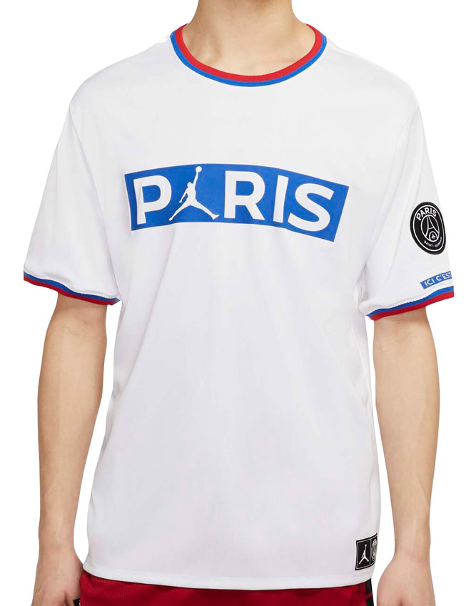 どことなくユニフォーム的なデザインのレプリカトップ。左袖と背面首元に“ICI C'EST PARIS(ここがパリだ)”をプリント。前面左裾にジョーダン×PSGのブランドタグを付ける。