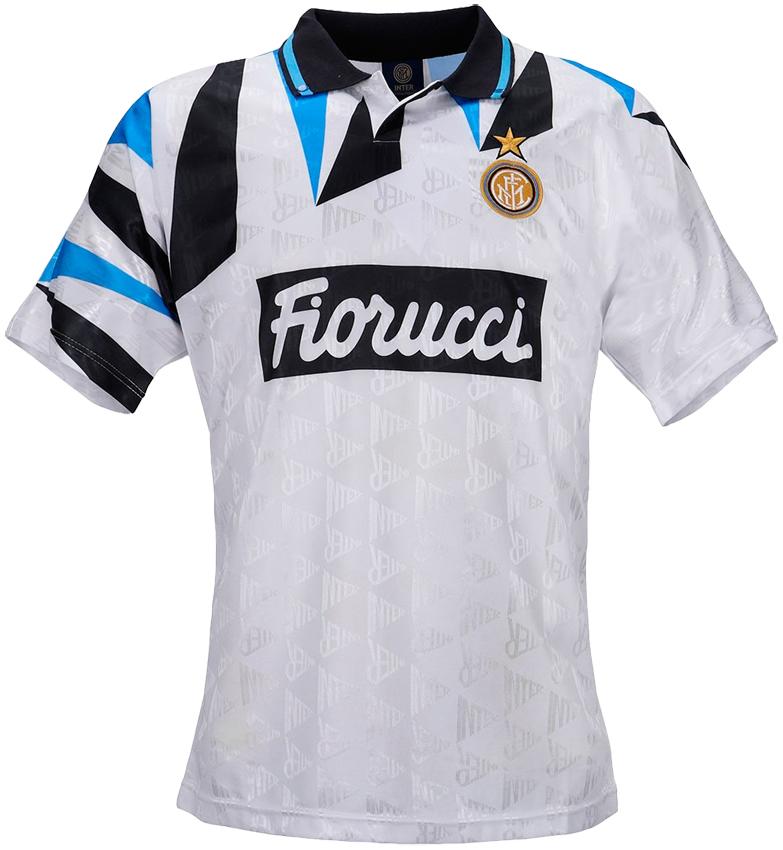 この92-93シーズンのみ使われたアウェイキット。肩部分のブルー&ブラックのグラフィックが特徴的なデザインだった。シャツ全体に“INTER”の透かしプリントをあしらっている。