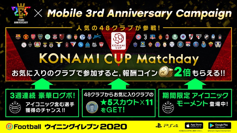 さらに、人気モバイルゲーム『eFootball ウイニングイレブン2020』が3周年となったことを記念し、KONAMIが感謝の気持ちを込めた「25th Anniversary x Mobile 3rd Anniversary Campaign」をスタートさせる。