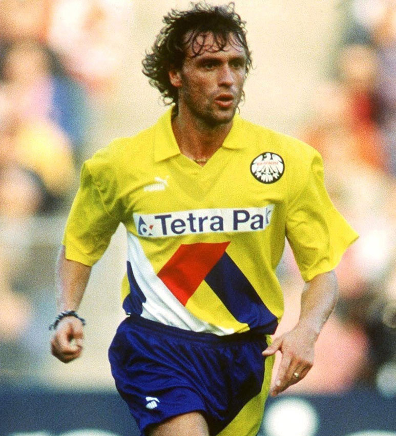 二度見するかもしれないが、長谷部と鎌田が所属するフランクフルトのユニフォームだ。このチーム、90年代はちょっと痛いデザインが多かった。