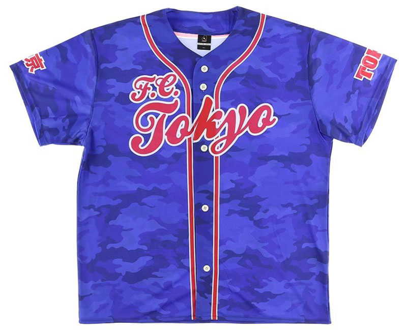 チームカラーのブルーとレッドで彩るシャツは、大胆にも迷彩柄をあしらった一着に。