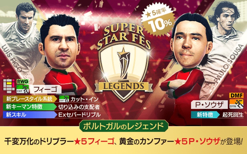 “SUPER STAR FES LEGENDS”には、右ウイングとして一時代を築き、世界最高のドリブラーとしてその名を轟かせた「ルイス・フィーゴ」と、豊富な運動量と激しい守備でポルトガル黄金世代の1人として名を馳せた黄金のカンファー「パウロ・ソウザ」が新★5選手として登場します。