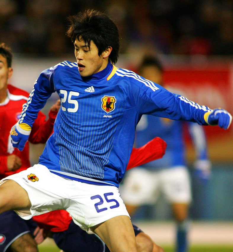 内田は2008年1月26日のチリ代表戦でA代表デビュー。この写真はまさにそのデビュー戦を捉えた1枚だ。ユニフォームはゴールドの放射状ラインが日の出に見えることから「ご来光モデル」と呼ばれた。