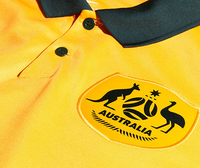 レプリカユニフォームのエンブレムは、FFAのシンボルマークを中心にカンガルー(左)とエミューの2頭の動物を描く。