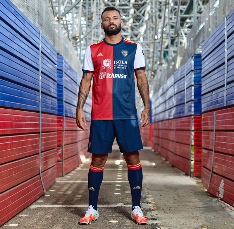 今季はadidasのキットを着用するカリアリ。右がレッドで左がブルーの半々デザインが伝統だが、袖をホワイトで彩るのはクラブ史上初となる。