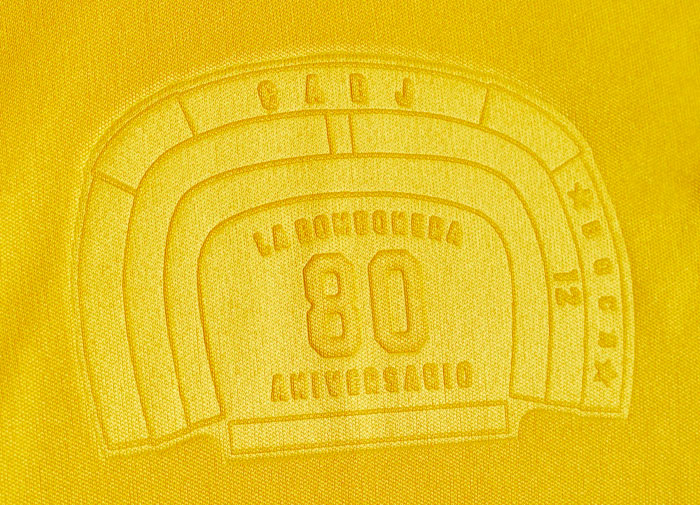 エンブレムとメーカーロゴの中間に、80周年記念のロゴマークをエンボスでプリント。独特な形状のスタジアムを再現し、“80 ANIVERSARIO”をレタリングする。