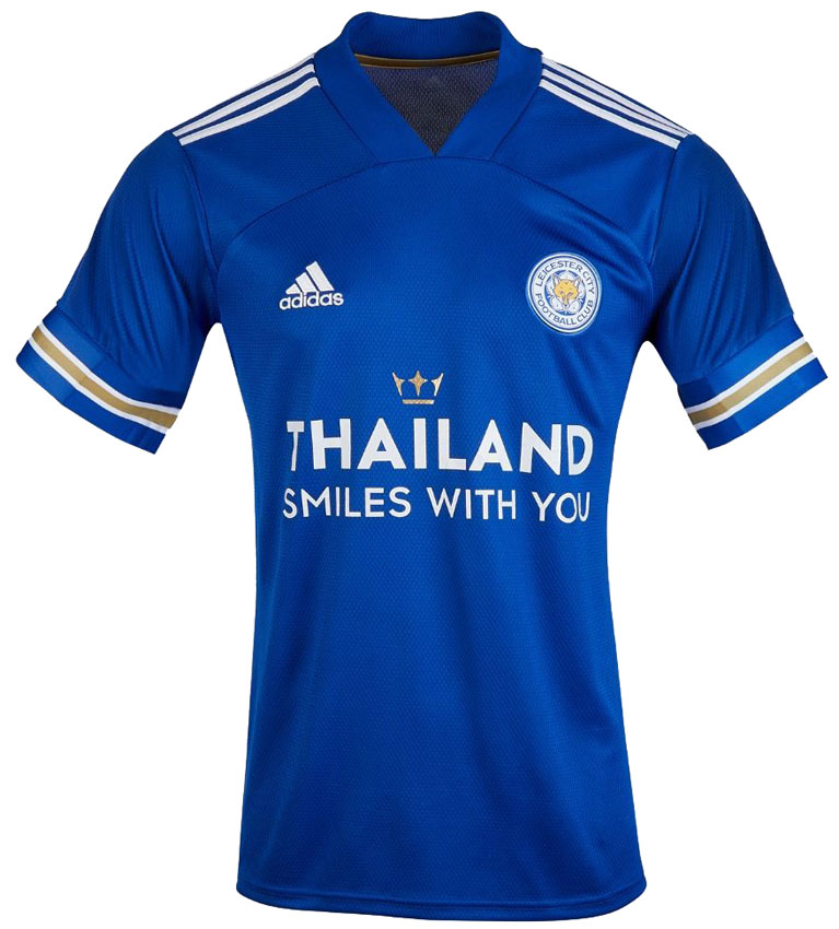 ホームキットは伝統のブルーを基調としたデザイン。胸にはタイの免税店「King Power」ではなく、タイ政府による観光促進キャンペーン「Thailand Smiles With You」のロゴマークを掲出する。