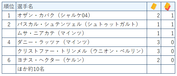 上記は2020-21シーズンのブンデスリーガのイエローカードランキングだ。一番右端が1試合にイエロー2枚で退場となったケース、右から2番目がイエローカードを1試合に1枚だけ受けたケースだ。