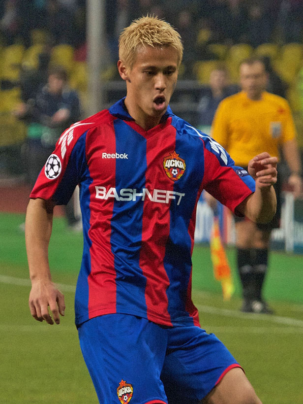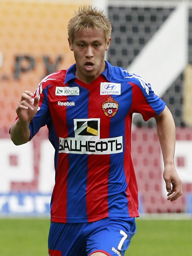 CSKAでの本田圭佑というと、このユニフォーム姿がまず思い浮かぶ。写真上はロシア・プレミアリーグ用で、下はUEFAチャンピオンズリーグ用。同じユニフォームなのだが、スポンサーロゴが異なるとだいぶ印象が変わる。