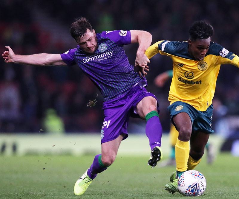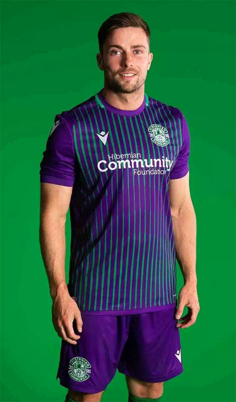 スコットランドのハイバーニアンは緑と白がクラブカラー。19-20シーズンのアウェイユニフォームは、紫に緑の差し色というスタイルだった。