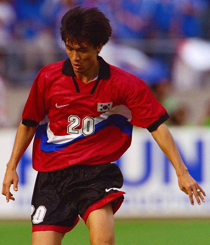 1997年9月28日に旧国立競技場で行われた1998フランスW杯予選。日本は先制に成功するも試合終盤に2失点し、ホームで逆転負けを喫した。当時のユニフォームは胸にエンブレムではなく国旗(太極旗)を装着。デザインも太極旗をモチーフにしたものだった。
