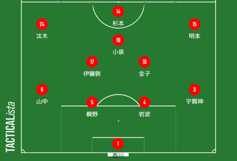 守護神は日本代表復帰を果たした西川周作で、ほぼ固定されている最終ラインは右から宇賀神友弥、岩波拓也、槙野智章、山中亮輔のセット。様々な組み合わせが試されている中盤では、ダブルボランチで金子、伊藤敦樹、阿部勇樹らがスタメンを争い、2列目は明本、小泉、汰木康也、田中達也、関根貴大らが起用されている。