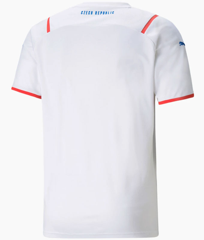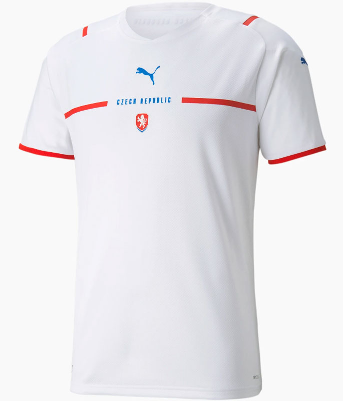 新アウェイユニフォームは、同じくPumaと契約するイタリア代表などと同様、胸にストライプを走らせるデザイン。メーカーロゴと小さめのエンブレムに挟まれる形で国名“CZECH REPUBLIC”をレタリングする。
