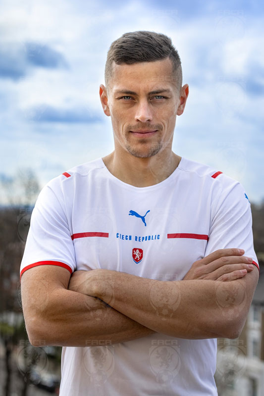 ホワイトを基調に、レッドのストライプとブルーのキャットロゴ。アウェイユニフォームはチェコ国旗の3色で構成されている。