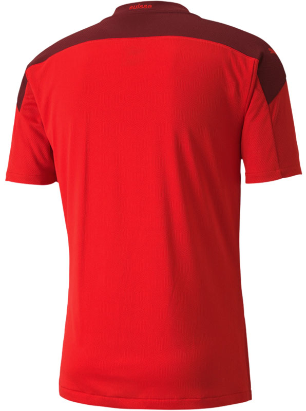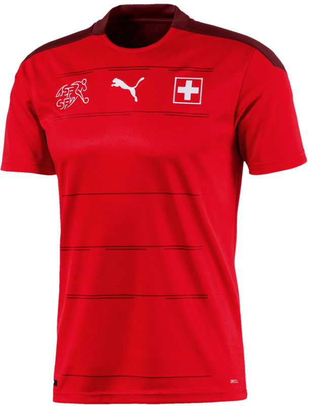 EURO2020に向けた新ホームユニフォームは、伝統のレッドを基調としたデザイン。胸部分は従来通り、左胸に国旗、右胸にスイスサッカー協会のエンブレムをそれぞれ取り付ける。