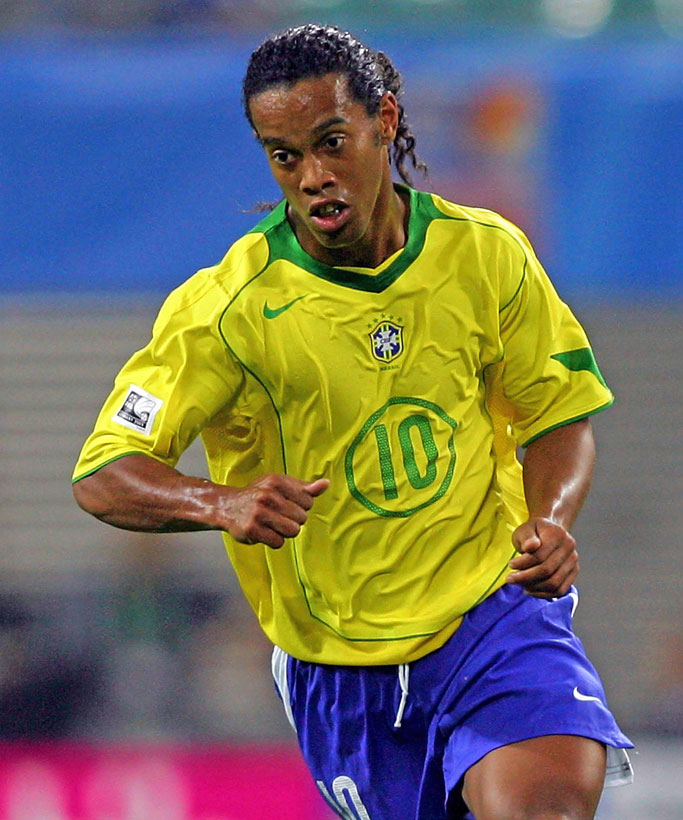 シャツの前面を一周するかのようなグリーンのパイピングが特徴的。丸で囲む胸番号もインパクトあるデザインだった。優勝した2004年のコパ・アメリカなどで使用。