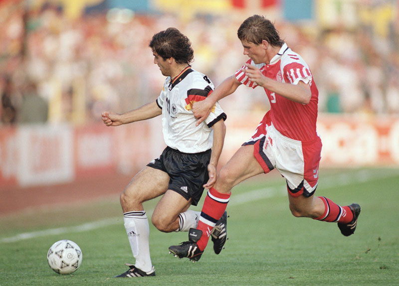 出場停止となったユーゴスラビアに代わっての代替出場だったが、奇跡のユーロ初優勝を成し遂げた。ダニッシュ・ダイナマイトを象徴する一着。
