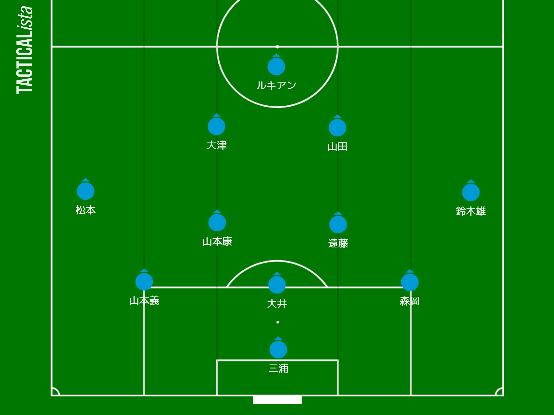 守護神は第6節のファジアーノ岡山戦から定位置を掴んだ三浦龍輝で、最終ラインは右が森岡陸または鈴木雄斗、リベロがDFリーダーの大井健太郎、左が山本義道の3バック。