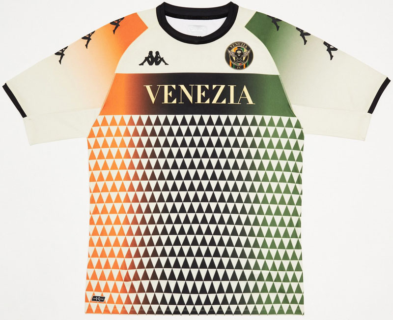 アウェイユニフォームはクリーム色を基調に、チームカラーのオレンジとグリーンを配するデザイン。細かな三角形はヴェネツィアの有名なモザイクをモチーフとしている。