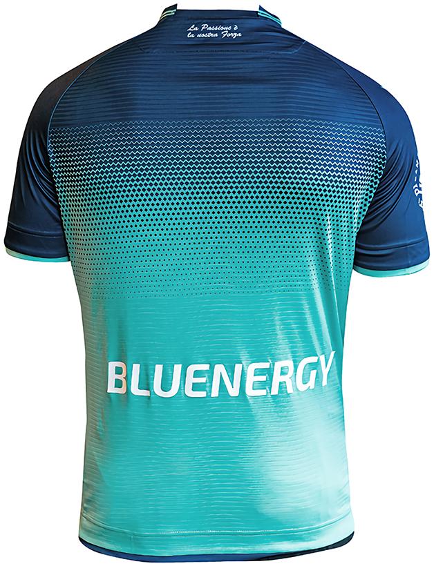 新アウェイユニフォームは、ダークグリーンとターコイズという組み合せ。前面・背面どちらも中央部分のグラデーションが印象的なデザインとなっている。