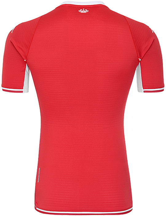 シャツ背面の首元にはエンブレムの王冠をプリント。パンツはレッド、ソックスはホワイトが基本スタイルとなる。