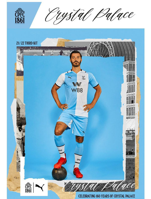 1851年の第1回万国博覧会の会場として建造され、クラブ名の由来となった建物「クリスタル・パレス」を描いたデザイン。ツートンカラーは。クラブが初めて着用そたキットデザインを再現したものだという。