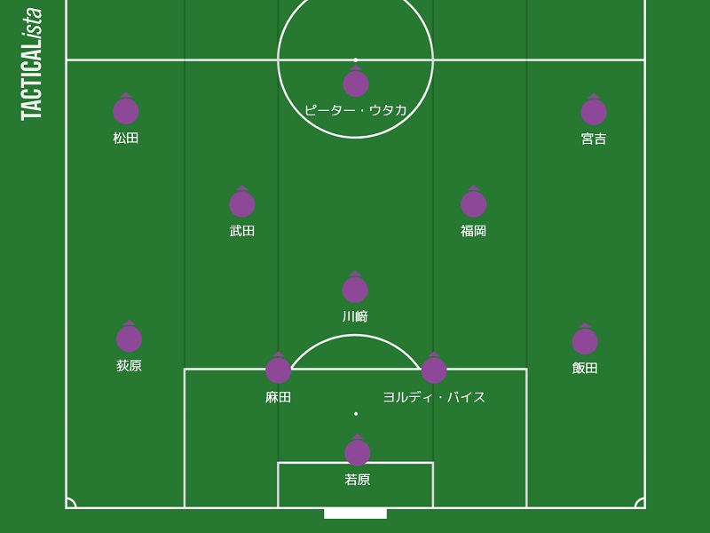 中盤はアンカーに川﨑颯太、インサイドハーフに福岡慎平(三沢直人)、武田将平(松田天馬)という3センターハーフ。